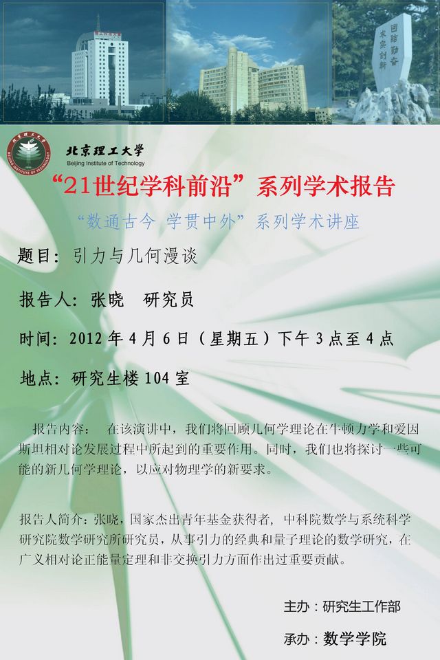 个人简介:张晓,国家杰出青年基金获得者, 中科院数学与系统科学研究院数学研究所研究员,从事引力的经典和量子理论的数学研究,在广义相对论正能量定理和非交换引力方面作 出过重要贡献。