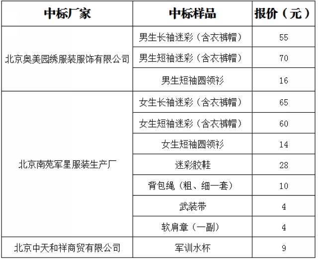根据学校采购相关政策,本着服务学生的宗旨,2015年学生军训用品的采购采用公开招标的方式进行。本次招标于4月14日公布标书,共有10家企业参与竞标。5月13日召开评标会议,通过现场开标、厂家陈述、评标工作组成员审阅标书、查看样品、进行评议,最后由评委进行打分。根据最终分数排名,北京奥美园绣服装服饰有限公司、北京南苑军星服装生产厂、北京中天和祥商贸有限公司分别中标,现将采购结果公示如下: