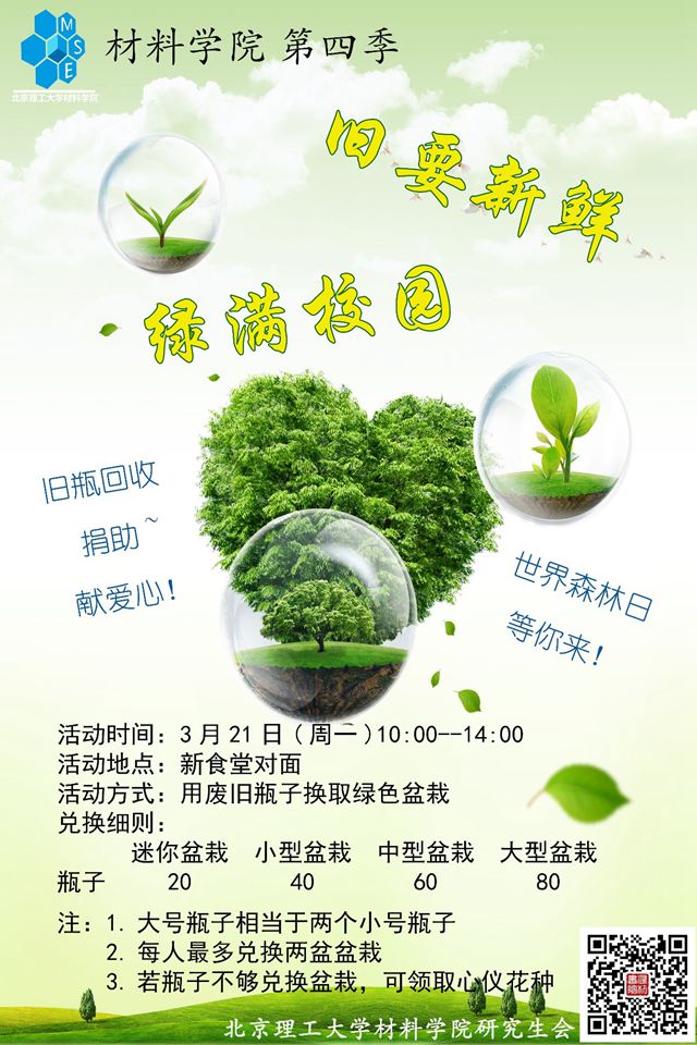 废瓶太多怎么办?扔掉?NO!快来参加材料学院第四季“旧要新鲜 绿满校园”环保公益活动,我们会为废瓶们寻找合适的去处。在“世界森林日”来临之时,用废旧瓶子换取心仪盆栽, 让环保从你我身边做起。