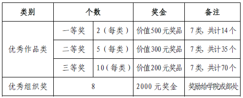 1.本次比赛分类设置一、二、三等奖若干,优秀组织单位奖,发放荣誉证书并给予奖励,具体奖励标准见下表: