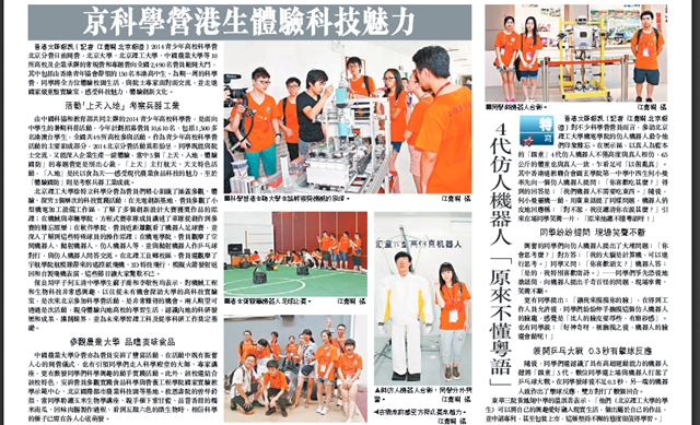 北京理工大学徐特立科学分营为营员们精心组织了涵盖参观、体验、探究3个层次的科技实践活动:在光电 创新基地,营员参观了小型机电加工设备工作区,了解了多个创新设计大赛获奖作品的原理;在机械与车辆学院,方程式赛车队成员讲述了车队从创作到参赛的难忘 经历;在软件学院,营员近距离观看了机器人足球赛,并深入了解到这些特殊球员的操作原理;在机电学院,营员观摩了空间机器人、抛射机器人、仿人机器人等, 并与抛射机器人作乒乓球对打,与仿人机器人问答交流。在北理工良乡校区,营员还观摩了宇航学院航模队带来的遥控纸飞机、3D特技飞行、模拟火箭发射返回和 自製飞机表演,这些节目让大家惊歎不已。