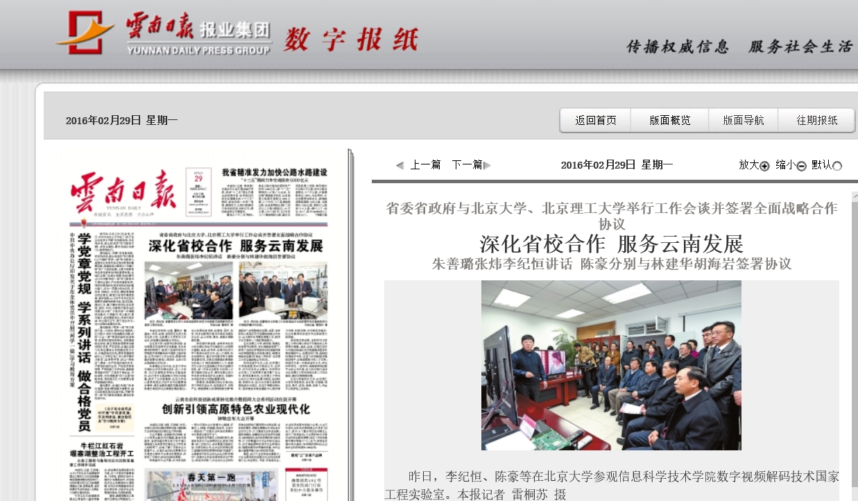 本报北京专电(记者 瞿姝宁 谭晶纯)昨日,省委、省政府在北京分别与北京大学、北京理工大学举行工作会谈,并签署全面战略合作协议。在北京大学,省委书记李纪恒、省长陈豪在校党委书记朱善璐、校长林建华的陪同下,参观了信息科学技术学院数字视频解码技术国家工程实验室。在双方举行工作会谈后,陈豪与林建华签署《云南省人民政府北京大学全面战略合作协议》。朱善璐在会谈中说,北京大学与云南的合作历史源远流长,在人才培养、对口支援等多领域合作基础良好。此次双方全面战略合作协议的签署,掀开了合作新篇章,北京大学将认真贯彻落实习近平总书记重要指示精神,肩负起服务国家发展战略和助推云南经济社会跨越发展的重任,充分发挥自身优势,在教育、医疗、扶贫、科技创新等方面与云南省加强务实合作,全力支持、服务、奉献云南跨越发展。