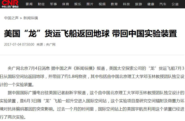 据中国之声《新闻纵横》报道,美国太空探索公司的“龙”货运飞船7月3日从国际空间站返回地球,并带回了约1.8吨物资,其中包括由中国北京理工大学邓玉林教授团队独立设计的一个实验装置。