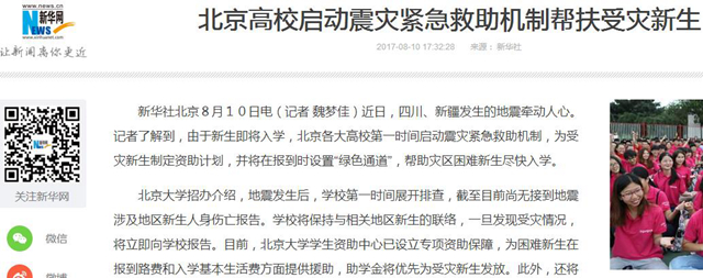 新华社北京8月10日电(记者 魏梦佳)近日,四川、新疆发生的地震牵动人心。记者了解到,由于新生即将入学,北京各大高校第一时间启动震灾紧急救助机制,为受灾新生制定资助计划,并将在报到时设置“绿色通道”,帮助灾区困难新生尽快入学。