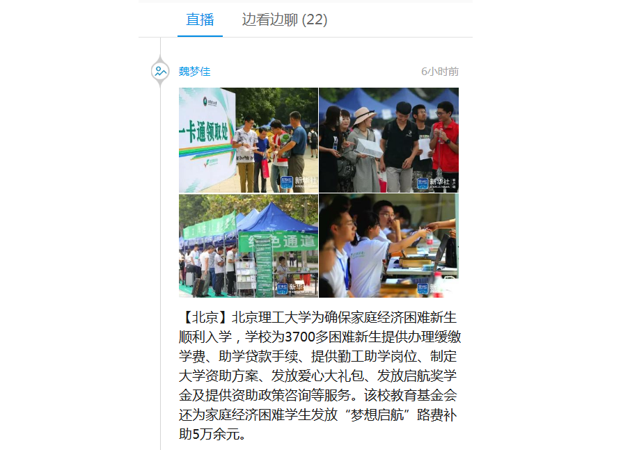 北京理工大学为确保家庭经济困难新生顺利入学,学校为3700多困难新生提供办理缓缴学费、助学贷款手续、提供勤工助学岗位、制定大学资助方案、发放爱心大礼包、发放启航奖学金及提供资助政策咨询等服务。该校教育基金会还为家庭经济困难学生发放“梦想启航”路费补助5万余元。