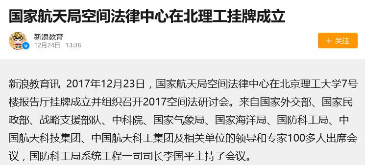 【新浪教育】国家航天局空间法律中心在北理工挂牌成立