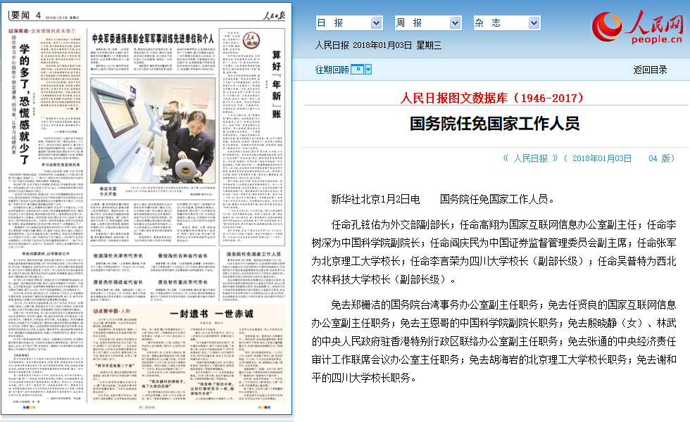 任命孔铉佑为外交部副部长;任命高翔为国家互联网信息办公室副主任;任命李树深为中国科学院副院长;任命阎庆民为中国证券监督管理委员会副主席;任命张军为北京理工大学校长;任命李言荣为四川大学校长(副部长级);任命吴普特为西北农林科技大学校长(副部长级)。