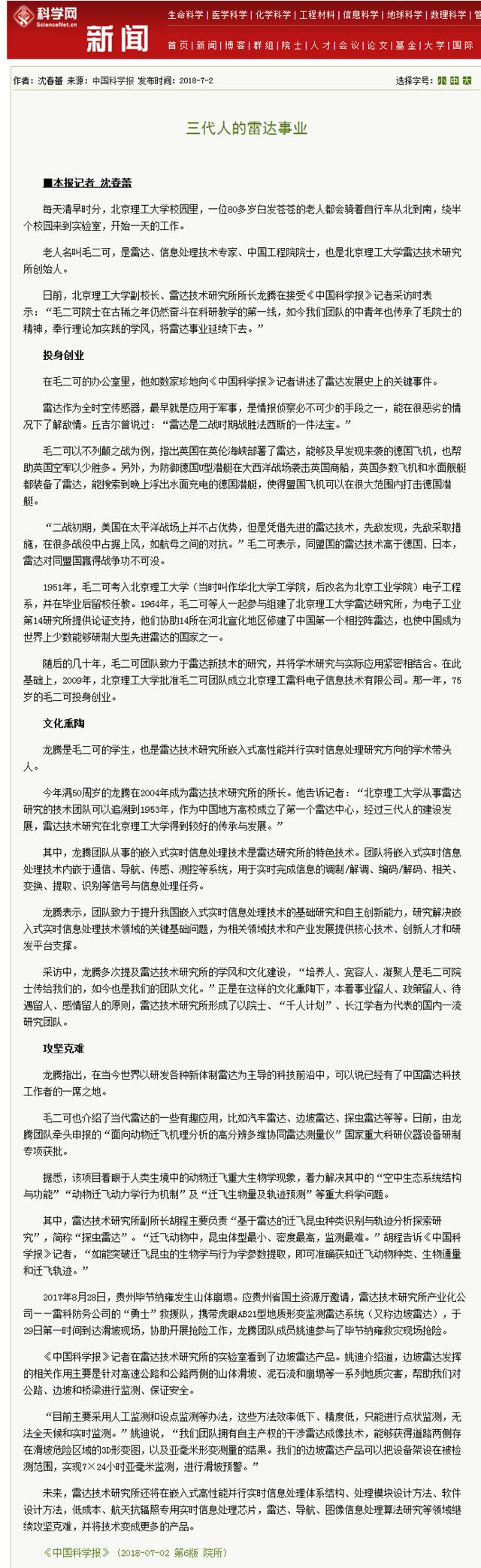 日前,北京理工大学副校长、雷达技术研究所所长龙腾在接受《中国科学报》记者采访时表示:“毛二可院士在古稀之年仍然奋斗在科研教学的第一线,如今我们团队的中青年也传承了毛院士的精神,奉行理论加实践的学风,将雷达事业延续下去。”