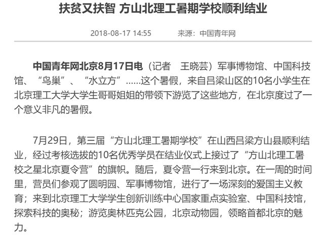 据了解,北京理工大学从2015年8月起定点扶贫山西省方山县。“方山北理工暑期学校”是北理工开展教育帮扶的重要举措,至今已连续举办三届。三年来,暑期学校运行机制不断优化,课程体系不断完善,教育成效与社会影响不断提高,成为方山县青少年素质教育的重要平台。目前暑期学校已面向全社会招生,并组建首期“方山北理工暑校之星”北京夏令营,将暑期学校的教育实效拓展延伸,努力做到教育帮扶的“扶智”与“扶志”相结合。