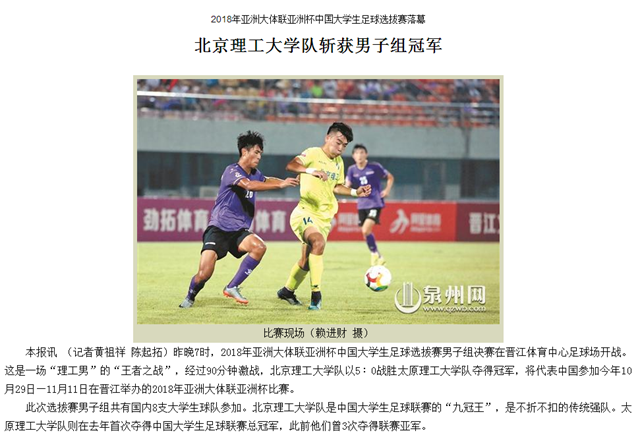 【泉州晚报】北京理工大学队斩获2018年亚洲大体联亚洲杯中国大学生足球选拔赛男子组冠军
