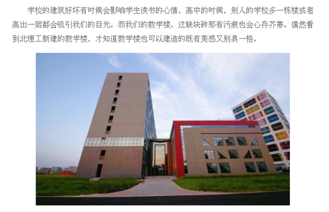 学校的建筑好坏有时候会影响学生读书的心情,高中的时候,别人的学校多一栋楼或者高出一层都会吸引我们的目光。而我们的教学楼,这缺块砖那有污痕也会心存芥蒂。偶然看到北理工新建的教学楼,才知道教学楼也可以建造的既有美感又别具一格。