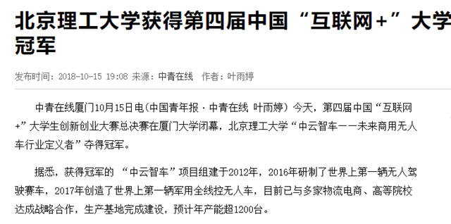 【中青在线】北京理工大学获得第四届中国“互联网+”大学生创新创业大赛总冠军