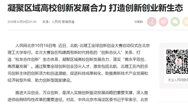 推进大众创业,万众创新,是深入实施创新驱动发展战略的重要支撑,深入推进供给侧结构性改革的重要途径。对此,中共北京市海淀区委书记于军表示,北京航空航天大学和北京理工大学作为海淀区的两所重点院校,始终围绕建设中国特色世界一流大学为目标,不断增强学生的创新精神、创业意识和创新创业能力,扎根中国创新创业的沃土,在全球范围内涌现出了一批又一批杰出的创新创业人才和创新创业成果,为中关村、为北京、为全国创新创业发展做出了重要的贡献。