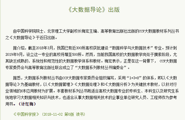 【中国科学报】北理工梅宏主编《大数据导论》于近日出版