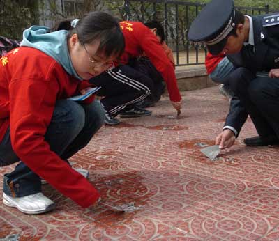 前天下午2点左右,中关村南大街上多了很多手拿小铁铲、扫帚、簸箕、塑料袋等工具的义务劳动者,他们都是北京理工大学的学生。两个小时左右,沿线近两公里路段的不干胶小广告被清理。