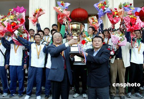 十一月四日,荣获全国足球乙级联赛冠军并晋升甲级联赛的北京理工大学学生足球队胜利凯旋,受到该校老师和学生的热烈欢迎和祝福。2006年11月2日,全国足球乙级联赛决赛结束,北京理工大学学生足球队经过激烈拼搏,以3:0战胜哈尔滨毅腾队,荣获全国乙级足球联赛冠军和道德风尚奖,球队主教练金志扬荣获最佳教练员奖。图为北京理工大学校长匡镜明(左)和球队主教练金志扬(右)高举奖杯和队员们合影留念。中新社发 张勤 摄