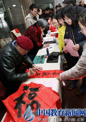 ▲1月26日,北京理工大学精于书法艺术的老教师为家庭经济困难大学生义务书写春联,让他们把学校的祝福带回家。本报记者 修伯明 摄