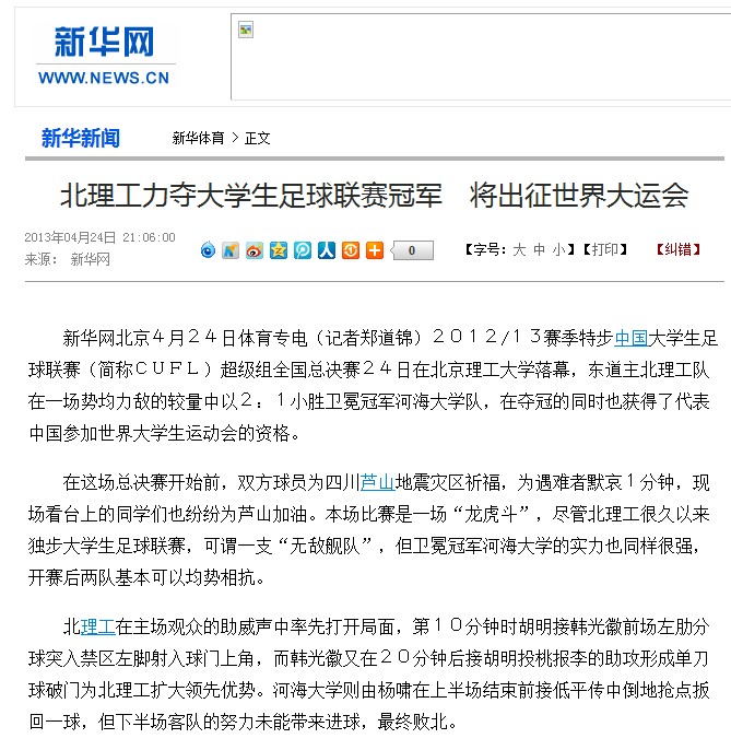 【媒体理工】多家媒体报道北京理工大学力夺大学生足球联赛冠军