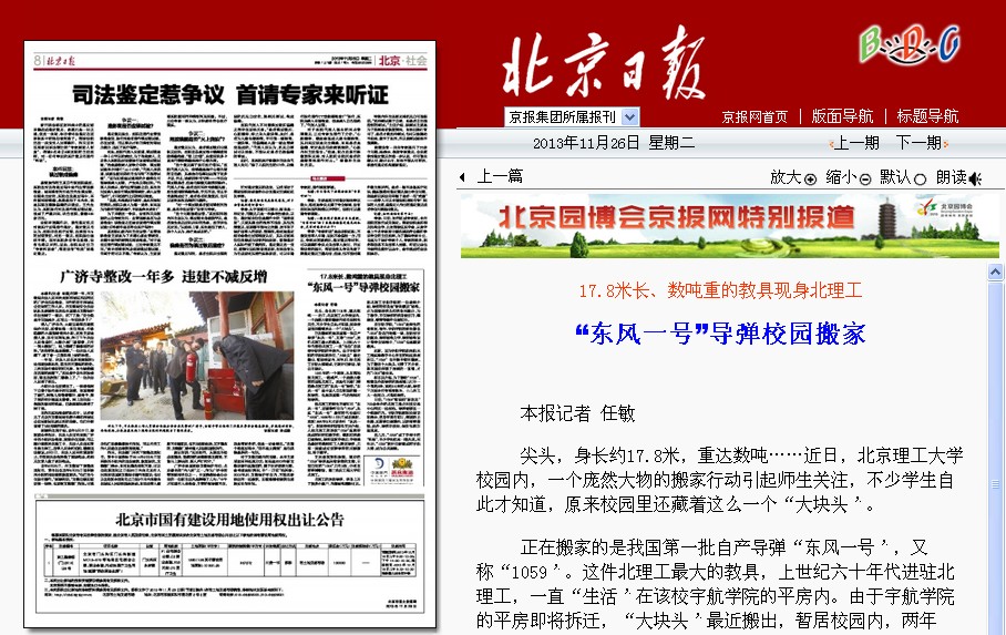 【北京日报】“东风一号”导弹校园搬家