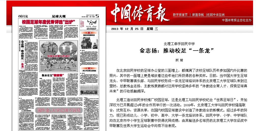 与此同时,针对北京学校足球至今只培养出杨昊一名优秀职业球员的事实,金志扬也道出了自己的忧虑:“在西城区,像回民学校这样拥有标准足球场的中学,可能只有两个,整个北京也不多。我们想开展足球,最基本的条件是场地,可是北京呢?我在向领导汇报时也强调过,全国有3000万大学生,超过了足球强国荷兰全国的人口。如果学校里推广起来,这个力量势不可挡。作为实施体教结合典型的北京理工大学,我们的目的不是让自己变成职业俱乐部,而是要把这种模式向全国各地推广。大学的推广,基础是中小学,中国足球的根就在于中小学。不推广校园足球,青少年足球就是空话。我们来到这,就是为了推广足球进入校园,而不是让回民学校培养多少优秀球员,是要让这种模式使我们的校园足球能够向中学拓展,中学向小学拓展。北京市如果有100个回民学校的足球发展起来,大学就不存在人员匮乏的现象,中国足球也不会存在这样的问题。道理很简单,但真正做到不容易。体育就是教育的一部分,二者不能分离。”