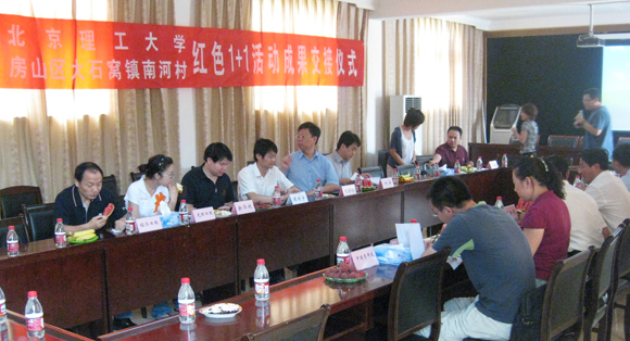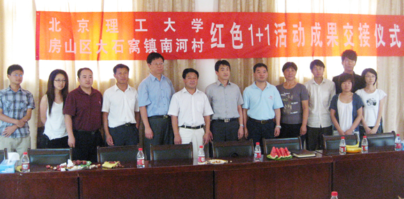 2009年7月5日,北京理工大学设计与艺术学院2006级本科生第一党支部与房山区大石窝镇南河村党支部开展“红色1+1”活动成果交接仪式在南河村举行。仪式由设计与艺术学院党委副书记、副院长丛磊老师主持,北京理工大学党委学生工作部副部长杨海老师,设计学院党委书记杨海滨老师,设计学院分团委书记周明宇老师,南河村党支部委员和南河北星企业负责人以及设计学院2006级本科生第一党支部全体党员出席仪式,经济日报、光明日报、新京报、北京晨报、新华网等多家媒体参加了交接仪式。