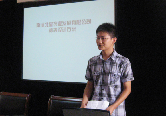设计学院06级本科生第一党支部书记严谦同学首先介绍了本次“红色1+1”活动的内容和取得的成果,重点介绍了支部党员为南河村南河北星农业发展有限公司设计的十余套企业标识方案。尚硕同学对最终选用方案的设计理念与含义进行了详尽的阐述,并介绍了由此标志完成的企业VI手册。