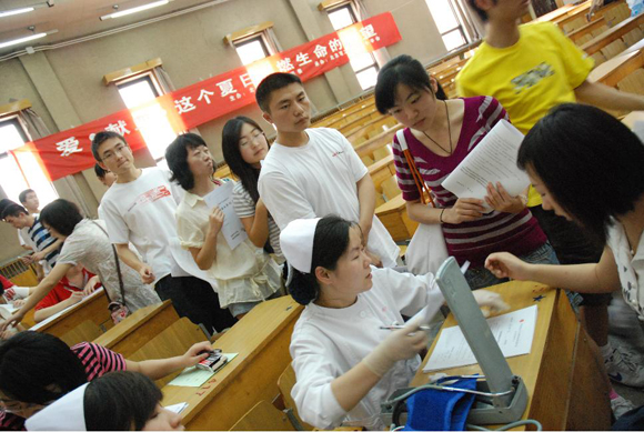 校团委副书记衡靖老师也莅临现场,亲切问候献血者,鼓励志愿者继续提供优质服务,并感谢北京市红十字血液中心血液科的医生和护士的敬业奉献。尽管天气炎热,汗水不停地顺着脸颊滴下,对与献血者和工作人员都是一大考验,但现场没有一句抱怨,没有一句不满,所有的人默契配合,现场各项工作有条不紊,气氛温馨感人。当得知有的男生捐献400毫升血液时,大家都会为他鼓掌,主动端起一杯糖水送到他的跟前。