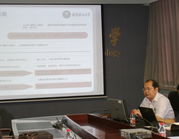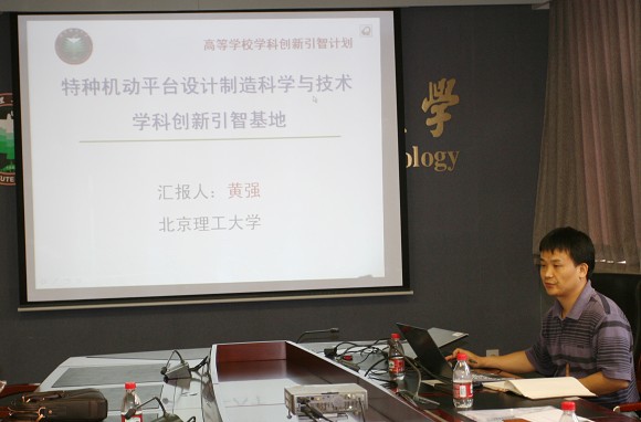 “特种机动平台设计制造科学与技术学科创新引智基地”负责人黄强教授从基地团队建设、研究方向选择和基地建设进展等几大方面详细汇报了自2008年基地成立以来所取得的成果。