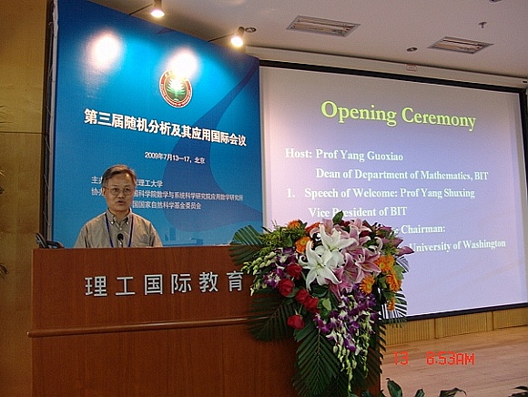 2009年7月13日,第三届随机分析及其应用国际会议开幕式在我校国际教育交流中心三层报告厅隆重举行。本次全球年会由北京理工大学理学院主办,中国科学院数学与系统科学研究院应用数学所及国家自然科学基金委员会协办。会议由我校长江特聘讲座教授陈振庆和“双聘院士”马志明(中国数学会理事长)作为学术委员会主席。中国科学院院士严加安、马志明、陈木法、彭实戈,中科院数学与系统科学研究院应用数学研究所所长巩馥洲,国际数理统计学会 (简称IMS)前任主席、第三世界科学院院士、新加坡国立大学教授Louis Chen,我校长江特聘讲座教授、美国华盛顿大学教授陈振庆,德国著名数字家Rene Schilling教授,法国著名数学家Rainer Buckdahn教授等近30名随机分析及其应用研究方面的国际一流学者出席了此次会议,并有多名随机分析方面的国内长江学者和杰出青年基金获得者参加此次大会。