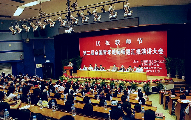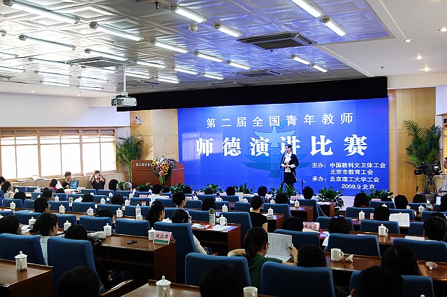 为进一步加强教师职业道德建设,充分展示广大教师爱岗敬业、无私奉献的精神风貌,弘扬当代教师教书育人、为人师表的职业情操,引导广大教职工全面贯彻党的教育方针,努力为推进素质教育、提高教育质量、深化教育改革,实施科教兴国、人才强国战略,建设人力资源强国,在第二十五个教师节来临之际,由中国教科文卫体工会与北京市教育工会主办、北京理工大学工会承办的第二届全国青年教师师德演讲比赛活动于9月2日至9月5日在北京理工大学圆满结束。政协十一届全国委员会副主席张梅颖,中华全国总工会副主席、书记处书记倪健民等领导同志出席了会议,并为这次比赛中的获奖者颁奖。