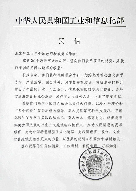 教师节前夕工业与信息化部向我校师生员工发来贺信