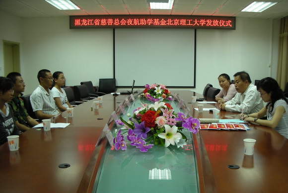 2009年9月15日下午,黑龙江省慈善总会夜航助学基金北京理工大学发放仪式在研究生楼第二会议室举行。副校长李和章、学生工作处副处长许欣、黑龙江电视台《新闻夜航》栏目记者安菲等出席了发放仪式。我校5名来自黑龙江省的2009级家庭经济困难新生获得了每人5000元的夜航助学金。发放仪式由学生工作处副处长许欣主持。《新闻夜航》栏目记者安菲向大家介绍了黑龙江省慈善总会夜航助学基金的情况,并播放了相关视频。