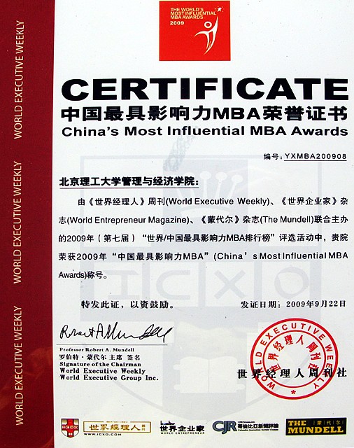 9月22日,在上海举行的世界经理人高峰会上发布了由世界经理人集团旗下《世界企业家》杂志编制的2009年“中国最具影响力MBA排行榜”。清华大学、北京大学、 南开大学、中山大学等国内著名高校商学院代表共同出席了发布仪式。经严格评选,层层选拔,在参选的近百所院校中,我校MBA项目获得排名第8位的好成绩。1999年诺贝尔经济学奖得主罗伯特·蒙代尔 (Robert Mundell)教授出席会议并给获奖的商学院颁奖。我校管理与经济学院副院长、副书记仇芳、EMBA教育中心副主任冉伦代表我校出席了会议。