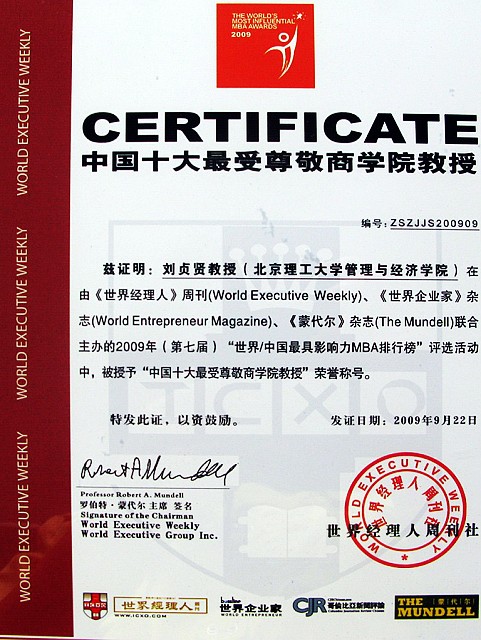 此次发布会同时发布了“2009中国十大最受尊敬商学院教授”评选结果,我校管理与经济学院刘贞贤教授成功入选。