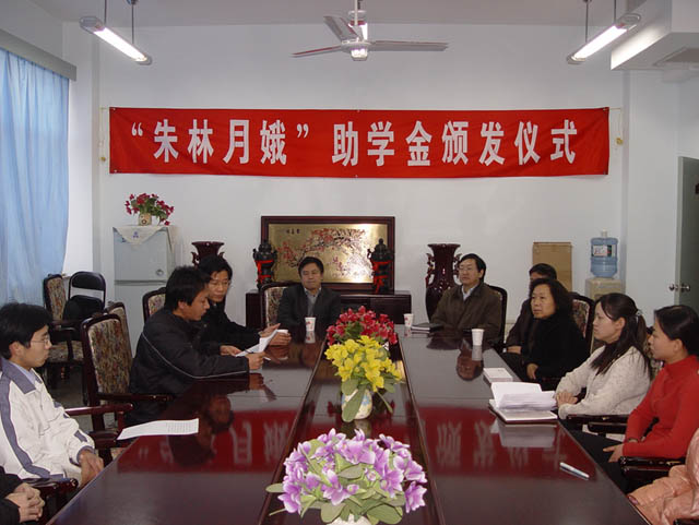 为了贯彻落实党中央关于关心困难群众生活的精神,让贫困大学生过好元旦。管理与经济学院于2004年12月30日下午在学院会议室召开——朱林月娥助学金颁发仪式,仪式由管理与经济学院党委副书记汪本聪主持,校党委副书记、副校长杨宾,校学生工作处处长刘明奇,管理与经济学院党委书记李波、副院长纪新华、王秀村,分团委老师及受助同学参加了仪式。