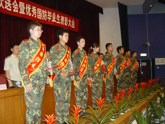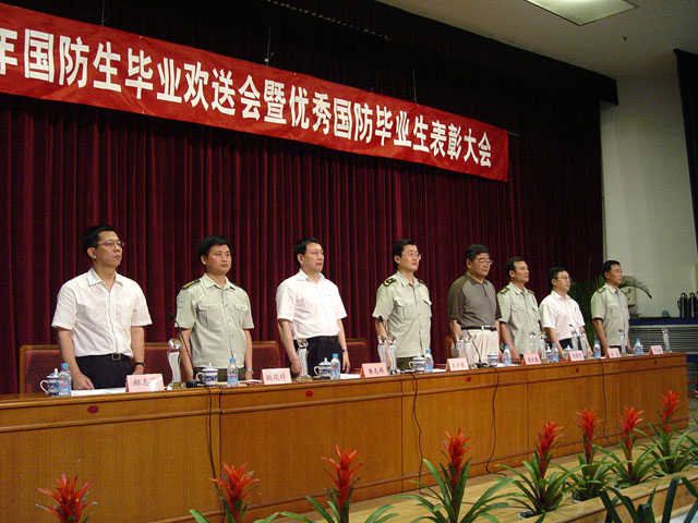 2005年6月21日下午,我校在中心教学楼一层报告厅召开了2005年国防生毕业欢送会暨优秀国防生表彰会。党委书记焦文俊,常务副校长李志祥,党委副书记、副校长杨宾,总参政治部副主任宋方敏少将、总参政治部干部部部副部长鲍延祥及通信部有关领导,以及全体在校国防生参加了欢送会。
