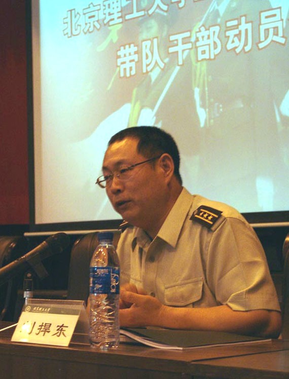 7月1日上午,北京理工大学2005年学生军训带队干部动员会在7#楼报告厅举行,党委副书记、副校长杨宾、副校长侯光明、学生工作处处长、武装部部长、军训旅总指挥刘明奇出席了会议,来自学生工作处、校团委、11个学院的专职学生工作干部及部分2001级优秀毕业生担任今年的带队干部,并参加了此次会议。会议由学生处处长、军训旅总指挥刘明奇主持。