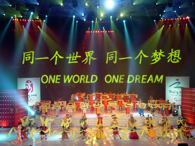 20时15分,在全场来宾的热切期盼中,李长春宣布北京2008年奥运会主题口号:“同一个世界,同一个梦想”。话音刚落,全场掌声雷动,覆盖在主题口号上的朵朵向日葵缓缓升空,“同一个世界,同一个梦想”(One world,One dream)呈现在世人眼前。
