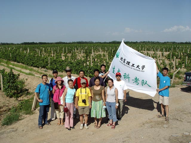 科考队员参观广夏(银川)贺兰山葡萄酿酒有限公司葡萄种植基地。