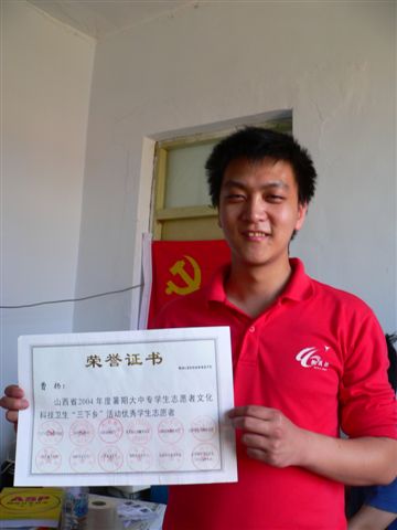 镜头六:淳朴的师生。都说山西人豪爽、淳朴,从一大早热情迎接我们的校领导身上,我们深深地领略到了这一点。我们到校时,同学们正在做早操,他们看起来是那么的自然、朴实。在和校领导及同学们的交谈中,他们言语里流露出的都是对志愿者们的夸奖,志愿者们给学校带来朝气和活力,教给学生知识和做人的道理,他们用自己的激情和汗水谱写了一曲志愿支教的青春之歌。