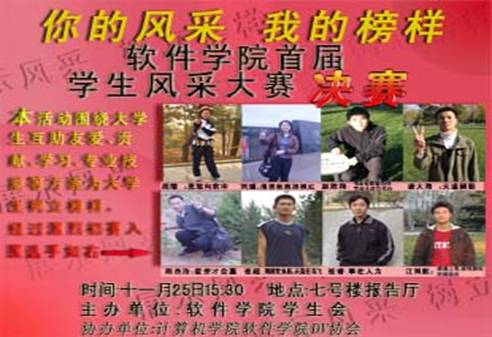 为了营造学院良好的学习氛围,促进学生综合素质的发展,弘扬优秀学生自强不息、互帮互助、乐于奉献精神,软件学院学生会举办了“你的风采,我的榜样”学生风采大赛,并于2005年12月2下午三点在七号教学楼报告厅进行了软件学院赛区决赛。