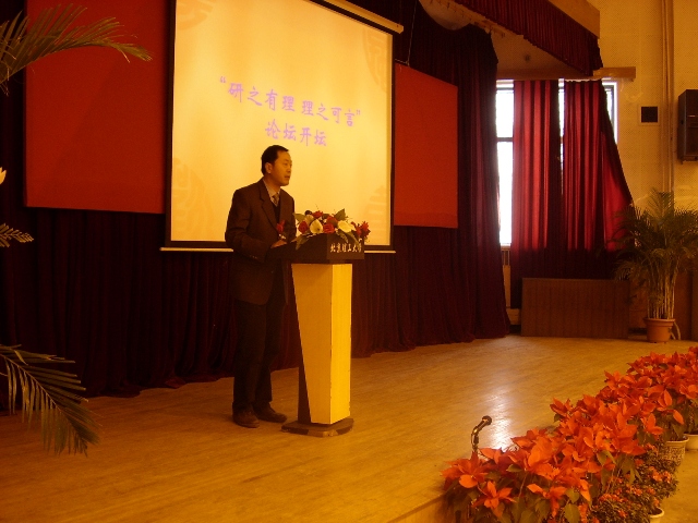研究生院副院长梅文博教授随后为本次研究生论坛寄语,梅院长介绍,“研究生学术论坛”是我校研究生教育创新工程的重点项目之一,也是活跃校园学术气氛、加强研究生学术交流的有效方式。理学院在发表科学论文、浓郁学校科研学术氛围以及为研究生创造相互沟通和学习平台等方面做了突出的贡献。他表示研究生院将继续大力支持研究生学术论坛、学术创新等活动。随后他宣布,“理学院2005年‘研之有理 理之可言’研究生学术论坛正式开坛。”