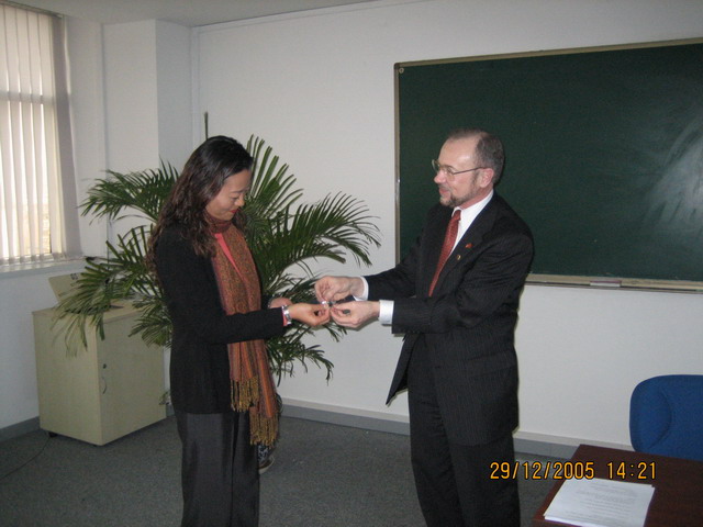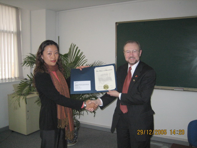 威斯康星州非常重视与中国在商业、教育等各方面的交流和发展。讲座开始前,杰姆·库茨先生将受威斯康星州州长委托转交我校党委书记焦文俊教授的证书以及威斯康星州徽章交与国际交流合作处汪滢老师,欢迎北京理工大学师生到威斯康星州访问、交流。