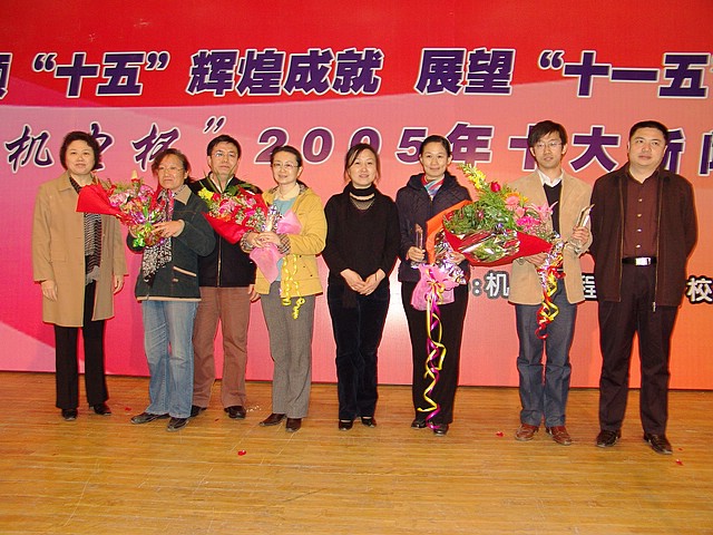 北京市教育工委宣教处处长狄涛、国防科工委新闻宣传中心新闻联络处副处长李珊珊、党办主任王文生、机电工程学院党委书记刘淑艳为2005年十大新闻评选活动一等奖获得者颁发奖杯。