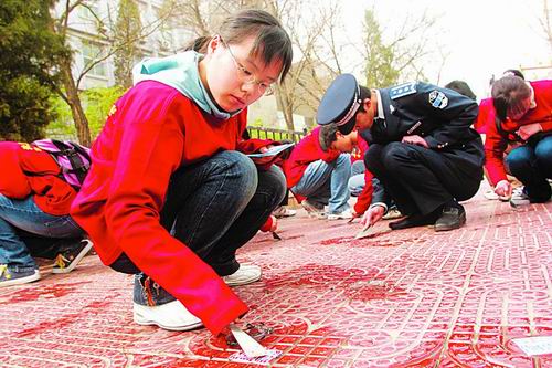 北京理工大学的学生们每周周日坚持与城市管理监察大队一起义务铲除街头违法小广告,将街道清理作为学生实践“荣辱观”的一项长期社会服务项目,以实际行动唤起市民对绿色街道文明的关注。