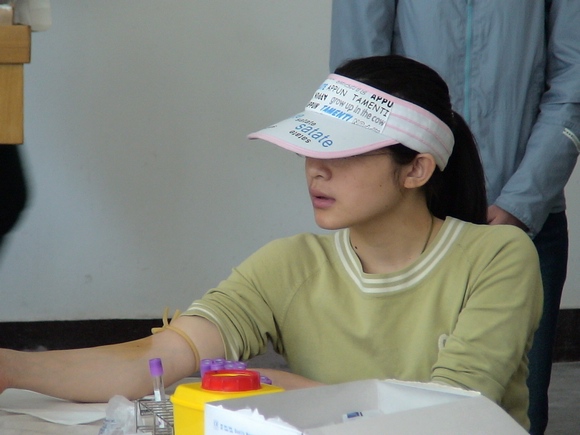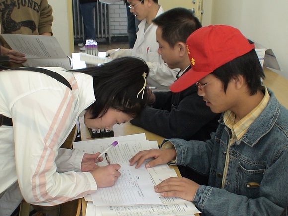 造血干细胞血样采集的程序并不复杂。志愿加入资料库的同学首先填写一张登记表,上面有个人姓名、身份证号、出生日期、工作单位、职业、联系方式、亲友联系方式、健康状况等个人信息。填写完毕,并经青协干事与志愿者之家的工作人员确认后,在七号楼306教室实施血样采集工作。在那里,每个捐献者进行编号后,工作人员仅仅抽取5毫升血液样本,就结束了整个采集工作。这也标志着同学成为造血干细胞资料库的正式成员,每个捐献者随后得到中国造血干细胞捐献者资料库管理中心颁发的荣誉证书以及纪念章。