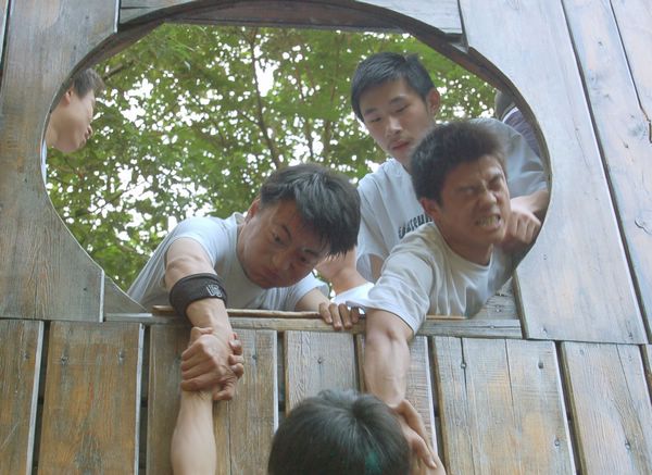 “遇难逃生”模拟海难情境,要求每队成员在规定时间内不借助没有任何工具,爬上4米多高的“船舱”,这个项目更是体现了团结才是力量的真谛。