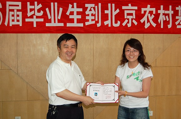 党委副书记、副校长杨宾逐一为28名到北京农村基层就业的毕业生颁发荣誉证书和纪念品。