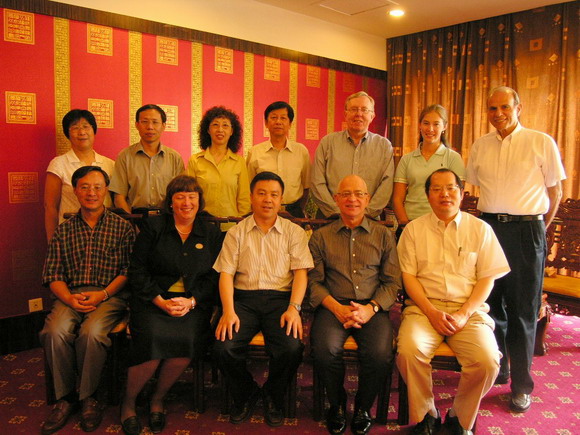 (前排中杨宾副书记、副校长,前排左二Moreen Weatherall副校长,前排左一Stevens物理系崔洪亮教授,前排右一国际交流合作处王庆林处长,右二Stevens网络教学部Robert Ubell主任;后排左二研究生院常务副院长吕昕教授,左三Stevens中国事务顾问陈映茜女士)