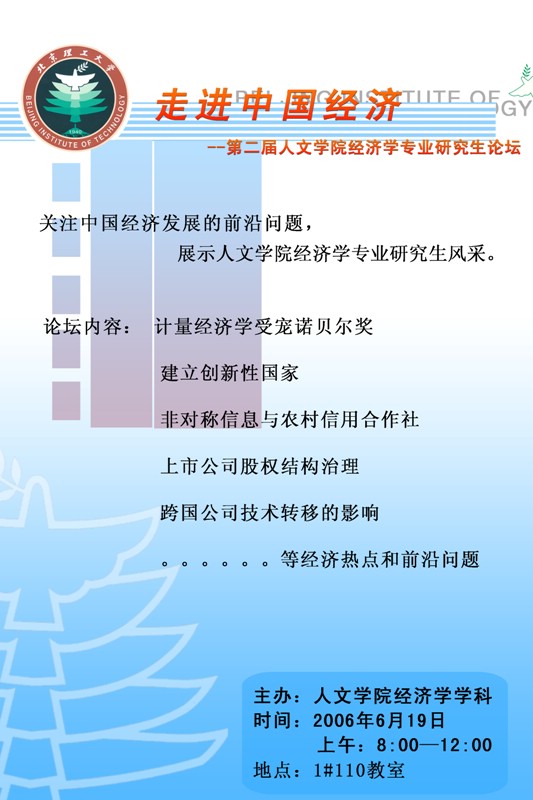 2006年6月19日,人文学院经济学专业成功举办了第二届“走进中国经济”论坛——立足科学的发展观,探讨中国经济发展问题。
